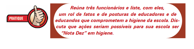 A comunidade escolar deve discutir a relação entre higiene, saúde e condição de vida. Como é um direito da população viver em condições adequadas de higiene e saúde, a educação deve ser capaz de alterar os hábitos e os comportamentos dos cidadãos. A prática educativa deve abranger toda a comunidade escolar, uma vez que devemos estar em condições de reivindicar nossos direitos. É preciso aumentar a competência dos indivíduos para tomar decisões em todos os setores em que a participação das comunidades é fundamental. A comunidade escolar deve ser preparada para discutir as relações entre saúde, higiene e alimentação, levando em consideração as condições de vida e os direitos dos cidadãos. Feita de maneira crítica e contextualizada, a difusão dos conhecimentos sobre esse tema beneficia toda a comunidade.