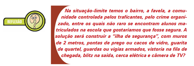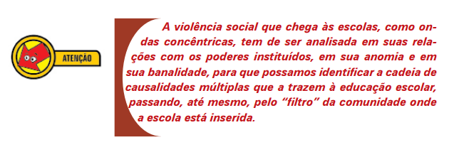 No espaço educativo, assim como é incorreto fazer da escola uma “ilha de segurança”, defendida da sociedade, também é impossível se trabalhar na perspectiva de uma sociedade sem violências, sem conflitos, na qual a escola pudesse um dia pacificamente se integrar.