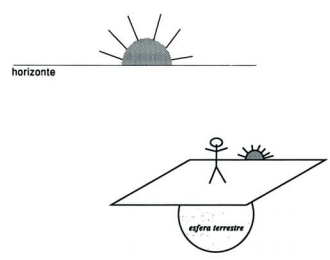 Um bom modelo para esta situação é imaginarmos que estamos com os pés assentes num plano - o plano do horizonte. Esse plano é tangente à esfera terrestre num ponto a que podemos considerar reduzida a ilha, já que é tão pequena. Sentimos imediatamente que existe uma desproporção enorme neste modelo. A distância do Sol à Terra é um pouco menos de 149,6 x 106 km e o raio da Terra (no equador) é apenas de 6378 km, logo a Terra é apenas um "ponto" girando em torno do Sol. O melhor, portanto, é reduzí-la também a um ponto, como fizemos à ilha. Está claro que nós, nesta abstração, ficávamos reduzidos a nada, mas deixemos ficar por mais algum tempo o nosso símbolo no desenho.