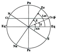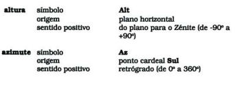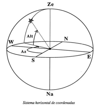 Temos praticamente todos os elementos necessários para definir um sistema de coordenadas que permita localizar qualquer objeto (estrela, planeta, etc.) na esfera celeste. Temos um plano diametral da esfera - neste caso o plano do horizonte - um eixo perpendicular a esse plano - a recta Ze-Na, orientada naturalmente no sentido Na ->Ze - e precisamos apenas de definir uma origem e um sentido de marcação dos ângulos sobre o plano. Tomaremos como origem o ponto cardeal Sul, e como sentido o retrógrado - ou seja, o dos ponteiros do relógio. Então, num determinado momento, podemos fazer corresponder a cada ponto da esfera celeste dois números - as suas coordenadas - que são as amplitudes de dois ângulos - a altura e o azimute desse astro.