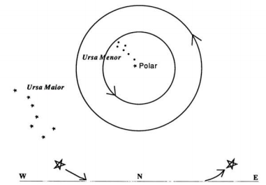 O céu escurece rapidamente. Onde há momentos não havia nada, a não ser o céu azul, começam pouco a pouco aparecer as primeiras estrelas. Para a direita do ponto onde o Sol desapareceu distingue-se já claramente a Ursa Maior, constelação bem conhecida. E recordamos a regra aprendida na instrução primária: prolongando sete vezes o segmento que une as duas guardas da Ursa Maior, encontra-se a estrela Polar. Depois, a partir desta, reconstitui-se a Ursa Menor, embora algumas estrelas desta constelação sejam bem mais dificeis de ver.