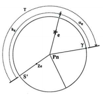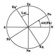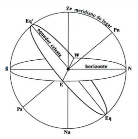 Como estamos situados no centro da esfera, podemos imaginar esse eixo prolongado a passar mesmo por nós e a ir encontrar a esfera celeste na estrela Polar. Define aí um ponto que é o Pólo Norte da esfera celeste. O outro ponto de interseção com a esfera celeste será o Pólo Sul da esfera celeste, mas a localização desse ponto, dada a latitude norte em que nos encontramos, está para nós inacessível, apenas a podemos imaginar. Se imaginarmos agora a interseção do plano do equador terrestre com a esfera celeste, obtemos outro círculo máximo da esfera celeste, o equador celeste. Na figura, podem ver-se, além do horizonte do lugar e da linha Zénite-Nadir, o equador celeste e o eixo de rotação aparente da esfera celeste, unindo o Pólo Norte celeste (Pn) ao Pólo Sul celeste (Ps). O círculo máximo que contém o Pn e o Ze de um lugar, cujo plano coincide na figura com o plano do papel, é o meridiano do lugar, que também se obtém por interseção do plano do meridiano terrestre com a esfera celeste.