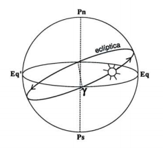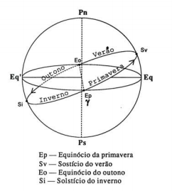 Da mesma forma como o movimento diurno aparente da esfera celeste e de todos os astros, incluindo o Sol, se explica pela rotação da Terra, o movimento aparente do Sol por entre as estrelas explica-se pelo movimento de translação da Terra. Como na sua órbita em torno do Sol o eixo de rotação da Terra mantém uma certa inclinação constante, o circulo máximo descrito (aparentemente) pelo Sol na esfera celeste, durante um ano, está também inclinado em relação ao equador celeste. A este círculo máximo, trajetória anual do Sol na esfera celeste, chama-se eclíptica. No seu movimento anual na esfera celeste, o Sol desloca-se no sentido indicado pelas setas, estando metade do ano abaixo do equador celeste e outra metade do ano no hemisfério norte celeste. Como sabemos, os pontos em que a eclíptica cruza o equador correspondem aos equinócios, e os pontos em que o Sol está mais afastado para norte e para sul do equador chamam-se solstícios. O equinócio da primavera (início da primavera no hemisfério norte) ocorre cerca de 21 de Março e dá-se quando o Sol passa do hemisfério sul para o hemisfério norte. A esse ponto de cruzamento do equador celeste com a eclíptica chama-se ponto vernal, que representaremos pela letra grega y. A primavera começa no equinócio da primavera, o verão no solstício de verão, o outono no equinócio de outono e o inverno no solstício de inverno.