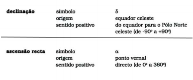 Já vimos como é possível estabelecer na esfera celeste um sistema de coordenadas, denominado horizontal, tomando como plano fundamental o horizonte celeste e como eixo a linha Ze-Na. Embora muito útil na prática da navegação marítima e aérea, por exemplo, este sistema tem o inconveniente de depender da posição do observador - o azimute e a altura de cada estrela, num dado momento, dependem da posição do observador. Daí a necessidade de conceber outros sistemas de coordenadas, como o sistema equatorial absoluto. Neste, o plano 12 fundamental é o equador celeste e o eixo é a linha dos pólos celestes. As duas coordenadas chamam-se ascensão recta e declinação. No quadro seguinte e na figura que o acompanha está especificado este sistema de coordenadas.