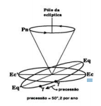 Devido ao fato da Terra não ser perfeitamente esférica, ela comporta-se de modo semelhante ao de um pião que lançamos sobre uma mesa. Neste, além do movimento de rotação em torno do eixo. o próprio eixo de rotação não tem uma direção fixa e descreve um cone com vértice no bico do pião. De modo análogo, o eixo de rotação da Terra não tem uma direção fixa e descreve uma superficie cônica com vértice no centro da Terra. O eixo dessa superficie cônica é a recta unindo os pólos da eclíptica (ver figura ao Ec acima). Assim, o pólo norte celeste descreve uma trajetória circular. Trata-se de um movimento muito lento, com um período de 25.800 anos. Só terá sentido chamar Polar à estrela da Ursa Menor, enquanto o pólo norte celeste estiver aproximadamente na sua posição. Há cerca de 500 anos, quando os navegadores portugueses se serviam da Polar para regressar a Portugal pelo meio do Atlântico, o pólo norte celeste distava da Polar cerca de 2°,5, ou seja cerca de cinco vezes o diâmetro aparente da Lua cheia. Uma distância apreciável, conhecida dos nossos navegadores, que a tomavam em consideração nos seus cálculos. Hoje dista cerca de 1°. Daqui a 12,800 anos, a estrela que se deveria chamar Polar será a Vega da constelação Lira.