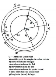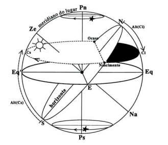 Para compreender melhor este mecanismo do movimento diurno, em particular do Sol, observemos a figura da página seguinte, onde está indicada a trajetória que um astro qualquer, nomeadamente o Sol, executa durante um dia, no seu movimento diurno.