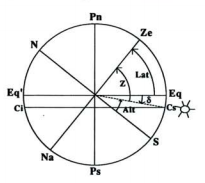 No momento em que se dá a culminação superior de um astro, é possível estabelecer certas relações simples entre a altura (Alt) do astro, a sua declinação (8) e a latitude geográfica do lugar (Lat). Na figura abaixo apresenta-se, um astro na culminação superior. Se determinarmos a sua altura nesse instante (Alt), e se for conhecida a sua declinação 8, a Lat do lugar é dada por: Lat = 8 + (90 - Alt).