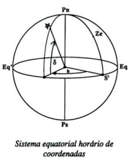 Quando queremos estudar um pouco os problemas da medição do tempo, temos que recorrer, para além dos dois sistemas de coordenadas que apresentamos - horizontal e o equatorial absoluto - a um terceiro sistema, o sistema equatorial horário. Este sistema tem ainda por plano fundamental o equador celeste, e uma das suas coordenadas volta a ser a declinação. Mas a ascensão recta é aqui substituída pela coordenada ângulo horário, medida também sobre o equador. A origem de contagem do ângulo horário é o ponto de intersecção com o equador do semi-meridiano do lugar que contém o Zénite (ver figura).