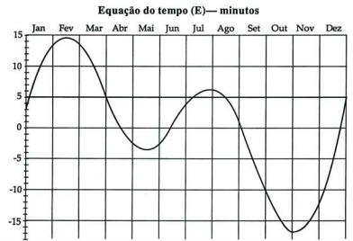 Cálculos relativamente complexos levam ao estabelecimento da equação do tempo (E) que é a diferença entre Tsv e Tsm. Assim, o tempo solar verdadeiro obtém-se a partir do tempo solar médio pela expressão: Tsv= Tsm + E , em que E é uma função periódica do tempo, habitualmente expressa por um gráfico ou por uma tabela. Apresentamos a seguir, um gráfico que permite obter valores da equação do tempo, ao longo do ano, em minutos, aproximação suficiente para as aplicações que desenvolveremos nesta coleção.