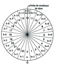 Em cada local existe um tempo solar médio, que poderemos designar simplesmente por tempo ou hora local. O tempo usado em Astronomia é o tempo solar médio de Greenwich, designado por UT (Universal Time) ou por TU (Tempo Universal). É conhecida a razão da criação dos fusos horários, evitando horas diferentes entre locais muito próximos. Na figura estão indicados e numerados os meridianos que limitam os fusos, e que estão separados por 15°, que corresponde como sabemos a uma hora. Dentro de cada fuso adopta-se como hora civil a hora correspondente ao centro do fuso. Na figura também estão assinaladas as diferenças entre a hora universal e a hora civil em cada fuso.