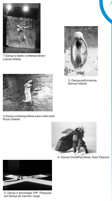 A foto número 5 apresenta um trabalho da coreógrafa e bailarina Carmen Jorge, criadora da PIP - Pesquisa em dança. Carmem desenvolve um trabalho para a dança e a tecnologia, no qual o corpo recebe diretamente a influência do meio externo e tecnológico na execução dos movimentos. À medida em que as suas pesquisas sobre a tecnologia e os meios externos foram se intensificando, percebeu a necessidade de encontrar um trabalho técnico na área da dança contemporânea e aprimorando-se nas pesquisas sobre o movimento foi transformando e facilitando as estruturas de uma formação acadêmica. Músicos e vídeo-artistas influenciam potencialmente na linguagem cênica.