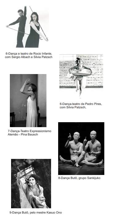 Todas as fotos a seguir, mostram uma maneira de inserir o corpo na dança, por meio de várias formas de movimento no espaço, apresentam diferentes formações, e podem proporcionar ao bailarino uma maneira de encontrar sua forma de expressão na dança, sua escolha estética e sua maneira de estar para o movimento do corpo. A arte cênica acontece quando há um diálogo com o outro e existe em uma contextualização, conceituação e uma comunicação. Os conceitos estéticos fazem parte da nossa maneira de pensar, de ver e de sentir a vida, e não necessariamente provém de uma habilidade virtuosa desenvolvida e adquirida. Podemos estabelecer por onde queremos começar a estudar o movimento do corpo, isto é, pelo físico ou pela pesquisa inserida na prática.