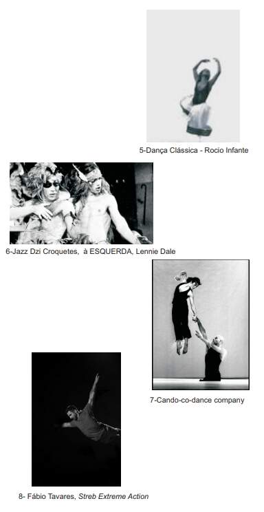 A foto número 4 apresenta a bailarina clássica brasileira Ana Botafogo, (re-)conhecida mundialmente pelo seu trabalho em grandes companhias de dança clássica. Ana encontrou um corpo particularmente apto para a linguagem e a necessidade de expressar os grandes clássicos, como, por exemplo, em Giselle, Quebra Nozes, entre outros. A foto número 5 mostra Rocio Infante em um salto dentro da linguagem da dança clássica, numa criação que fez parte do repertório do BalletMorozowicz, em 1979. A foto número 6 apresenta o grupo de Jazz Dzi Croquetes, que sob a direção do coreógrafo e bailarino de jazz norte americano, Lennie Dale, conseguiu uma forte linguagem e um estilo de expressão na dança que servia e serve aos musicais americanos. O bailarino se encontrava pronto para dançar, cantar e interpretar. O treinamento dos bailarinos/atores era intenso e baseado na técnica do Jazz.