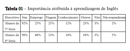 A relação entre inglês e conhecimento foi pouco mencionada por esses jovens. De acordo com a tabela acima, apenas 12% dos estudantes da quinta série e 10% dos da oitava referiram-se à obtenção de novos conhecimentos por meio do inglês.