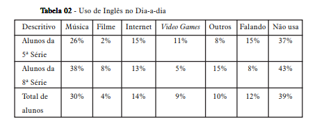 A música e a internet são os elementos motivadores mais citados em ambas as séries nesta utilização. Mostrando-se sintonizados com os avanços tecnológicos, alguns alunos utilizam inglês no computador com video games e internet. Isso ocorre principalmente nas lan houses. Os índices mostraram que 39% dos alunos não se percebem utilizando o inglês na vida cotidiana.