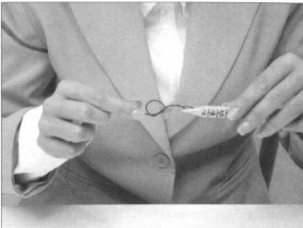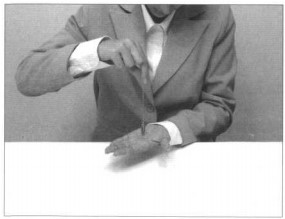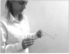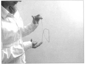 Segure o fio entre o indicador e o polegar, bem na ponta dos dedos, com as unhas bem alinhadas, a uns dois centímetros do topo do instrumento. Mantenha o pêndulo suspenso sobre a palma da mão li vre. Vamos detectar o V+ característico de todo o organismo vivo em boa saúde.