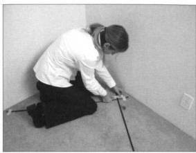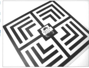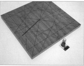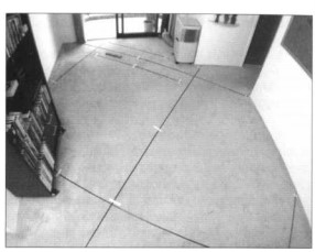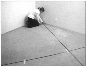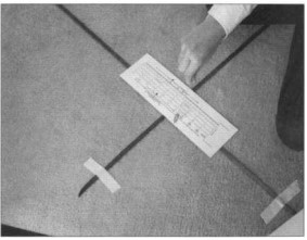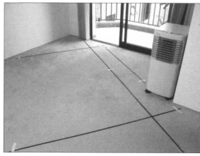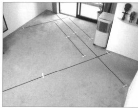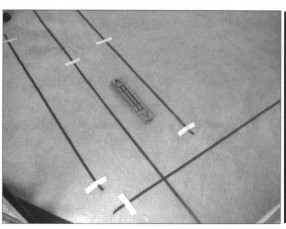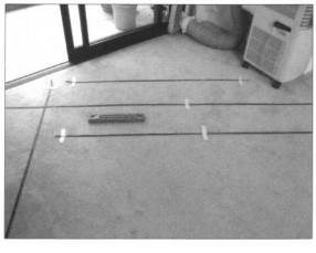Podemos ver na foto ao lado as duas primeiras faixas norte/sul e o primeiro cruzamento da faixa leste/ oeste, sempre colando as fitas com fita crepe, o que permitirá sua remoção posterior sem danificar o piso local. As fitas de tecido podem ser reaproveitadas para uma próxima mensuração.