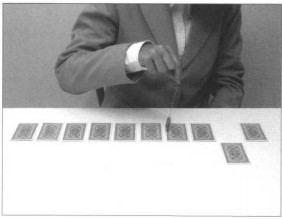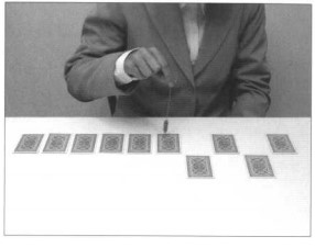 Coloque lado a lado dez cartas viradas para baixo. Pegue o pêndulo pelo ponto de suspensão encontrado anteriormente, coloque sobre a primeira carta a um centímetro de altura e formule a seguinte pergunta: Esta carta é vermelha? Se for vermelha gire para a direita, se não for, gire para a esquerda! Aguarde alguns segundos. Se a resposta for positiva, empurre a carta para a frente sem virá-la. Caso seja negativa, deixe-a no lugar e parta para repetir a pergunta sobre a segunda carta.