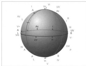 O espectro de ondas de forma, tal como se apresenta sobre uma esfera. Sobre a circunferência representando o equador, temos o espectro em fase indiferenciada ou o espectro eletromagnético. Em cada um dos meridianos encontramos o espectro em fase elétrica naquele alinhado na direção Leste-Oeste e o espectro magnético no alinhamento norte-sul.