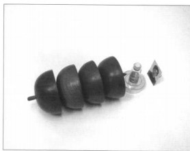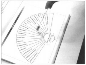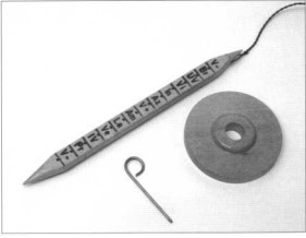 Os três componentes do pêndulo cromático de Cone Virtual: o pequeno bastão de pontas aguçadas apresenta uma face aplainada sobre a qual se inscrevem as doze vibrações do espectro de ondas de forma. Sobre o traço limitante de cada cor, um estreito furo permite a inserção de um gancho de apoio para o disco. Nas duas extremidades temos o Verde Negativo, o inferior, indicando correntes de água telúricas nocivas e o Verde Negativo superior, indicando a nocividade de falhas ou cavidades subterrâneas.