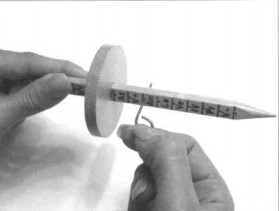 Insira o disco no bastão conforme indicado. Coloque o gancho no furo do V+. Quando na vertical, o disco se apoiará sobre ele sintonizando assim o pêndulo com a "onda" Verde Positivo. Esta é a única "cor" utilizada para a aferição do instrumento.