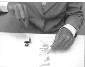 Mantenha o testemunho a sua direita de forma que o braço e a mão fiquem em uma posição confortável, permitindo segurar o pêndulo nesta situação por um período longo, sem que se produza fatiga ou tensão muscular. Procure usar um ponteiro para assinalar o que está perguntando, quando se tratar de listas, palavras ou frases bem próximas umas das outras.