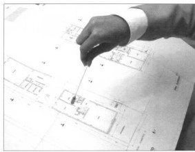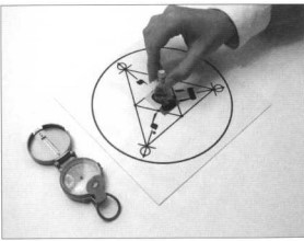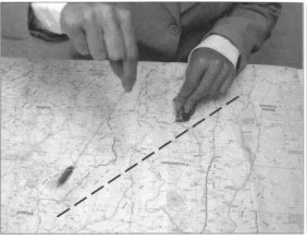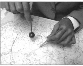 Na foto anterior, pode-se ver que traçamos uma primeira coordenada, lançando o pêndulo a partir da extremidade esquerda da área sob investigação. A mão livre aponta ou segura o testemunho do material a ser encontrado. Colocamos uma régua de plástico sobre a linha virtual traçada pelo pêndulo e o lançamos novamente, agora a partir de algum ponto aleatório, situado na extremidade direita do mapa. Claro que estamos partindo do pressuposto da existência do referido minério na área. Mais uma vez o pêndulo formará um ângulo. O ponto de cruzamento das duas coordenadas será o local central do veio ou por onde deve ser iniciada a exploração.