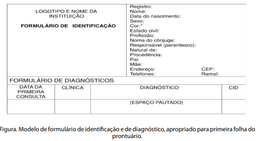 Conterá os dados de identificação do paciente (figura), como número de registro, nome, local e data de nascimento (ou idade aproximada), sexo, estado civil, nome dos pais, nome do cônjuge, profissão, pessoa responsável (citar parentesco se houver ), endereço, telefones (é relevante anotar mais de um número de telefone, pois frequentemente há mudanças), procedência (outra cidade, outra instituição de assistência médica).