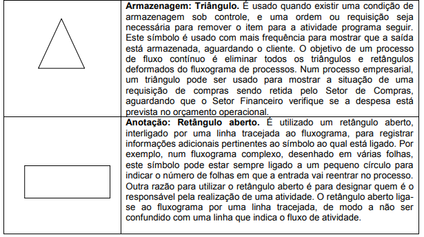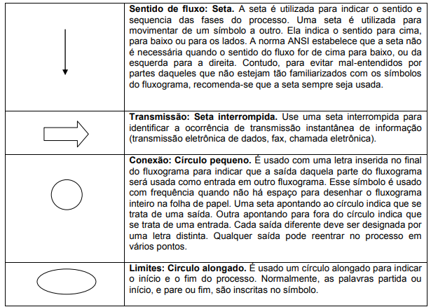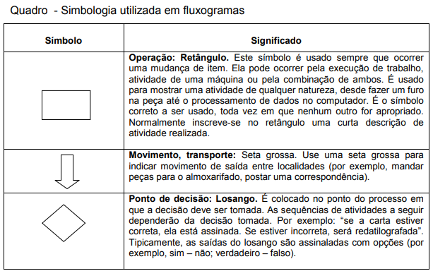 - Fluxograma padrão: é mais detalhado, servindo como manual para novos funcionários; nele existem alternativas para os momentos de decisão;