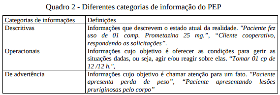 Após estas reflexões, e levando-se em consideração a taxonomia das diferentes categorias de informação propostas por Bieger e Glock, podemos considerar que, na realidade, o PEP é um documento multimídia, haja vista que em sua estrutura podem ser encontrados textos verbais e não verbais (sons- batidas do coração, imagens e símbolos). Estas informações podem ser classificadas em 3 grandes categorias: descritivas, operacionais e de advertência, conforme mostrado no quadro - 2.