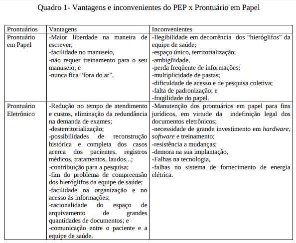 Assim como o prontuário em suporte tradicional, o PEP apresenta algumas vantagens e inconvenientes, como bem mostram Sabatini, Van Ginneken; Moorman, apresentados no quadro 1, a seguir: