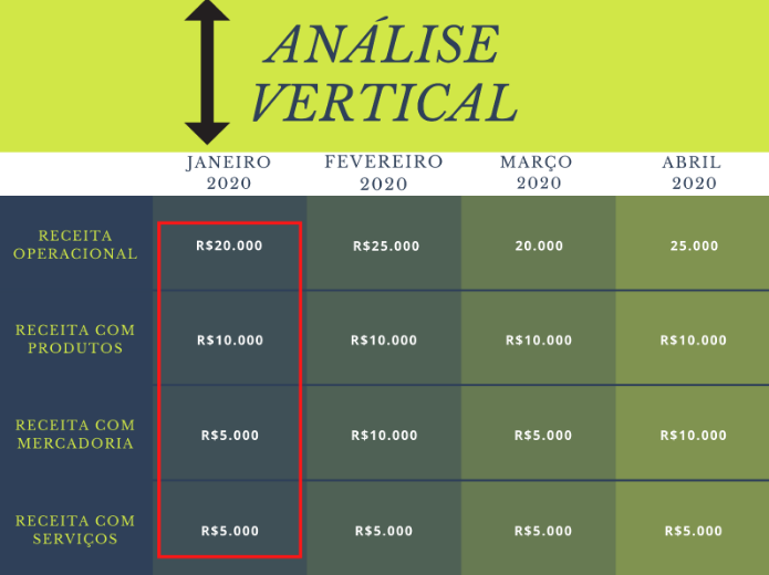 No exemplo dado é possível perceber que a RECEITA COM PRODUTOS (R$10.000,00) representa 50% da RECEITA OPERACIONAL (R$20.000,00) enquanto a RECEITA COM MERCADORIA (R$5.000,00) e a RECEITA COM SERVIÇOS (R$5.000,00) representam apenas 25% cada uma.
