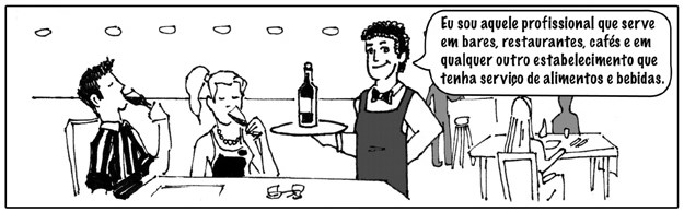 O garçom ocupa-se, principalmente, da recepção e acolhimento ao cliente, do serviço de alimentos e bebidas e dos cuidados com a arrumação do ponto de venda ou serviço.