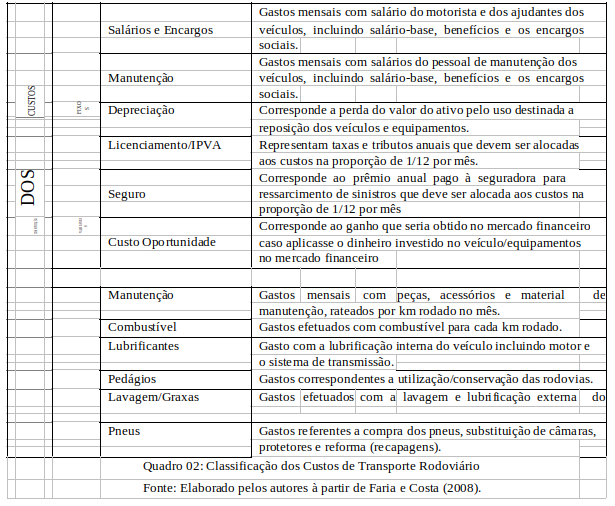 O quadro 02 apresenta a classificação de custos fixos e variáveis relacionados ao custo de transporte rodoviário.