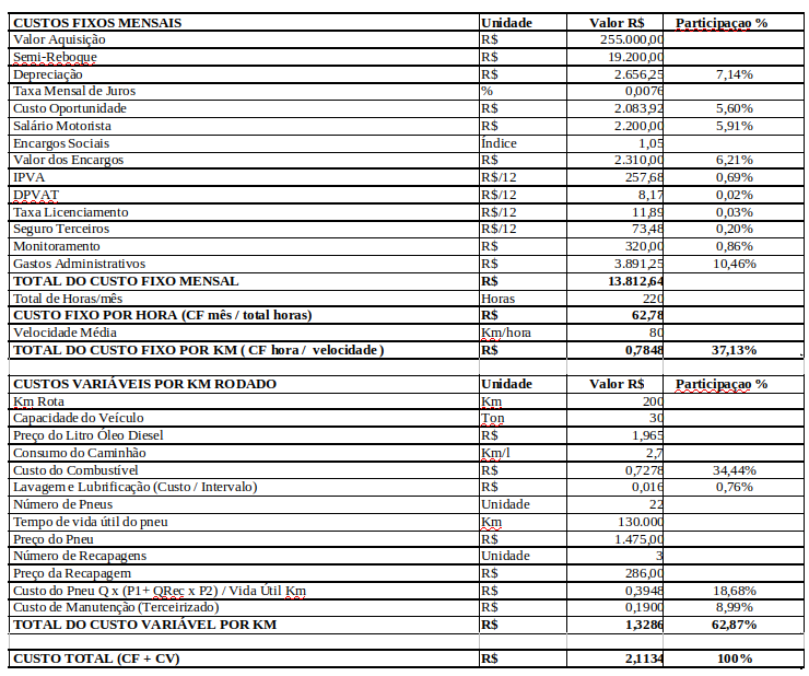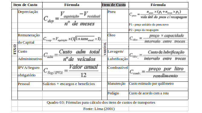 Segundo Lima (2001) os principais itens de custos do transporte rodoviário são: depreciação, remuneração do capital, salário e encargos pessoal, seguro do veículo, IPVA e seguro obrigatório, custos administrativos, combustível, pneus, lubrificantes, manutenção e pedágio.