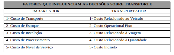 Ao tomar decisões relacionadas aos transportes, os fatores a serem considerados variam de acordo com a perspectiva do embarcador ou do transportador. O quadro 01 a seguir apresenta os principais fatores que influenciam as decisões do embarcador e do transportador: