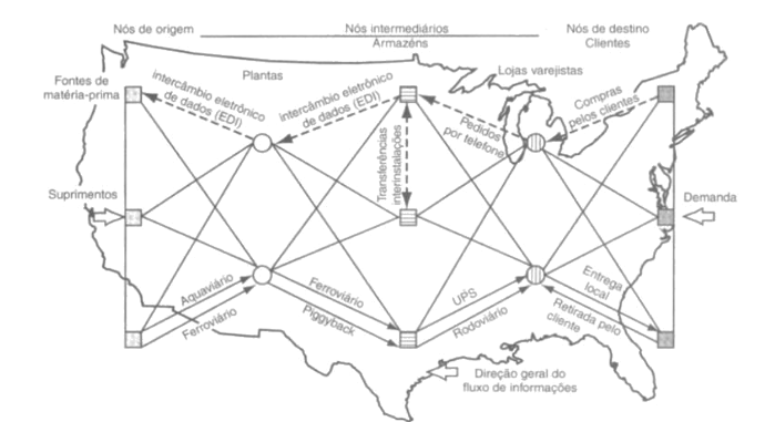 Pontos de estocagem — lojas varejistas, armazéns, fábricas e fornecedores são os nós.