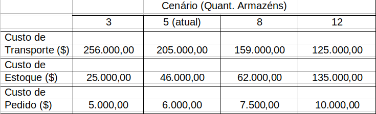 Uma empresa realizou o estudo de cenários supondo a variação da quantidade de armazéns que ela possui e o impacto desta mudança nas suas atividades primárias .