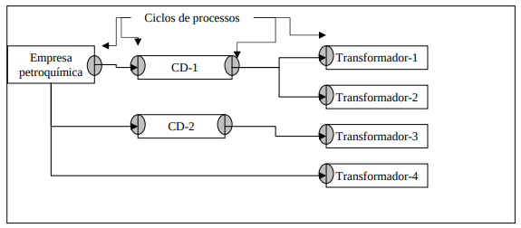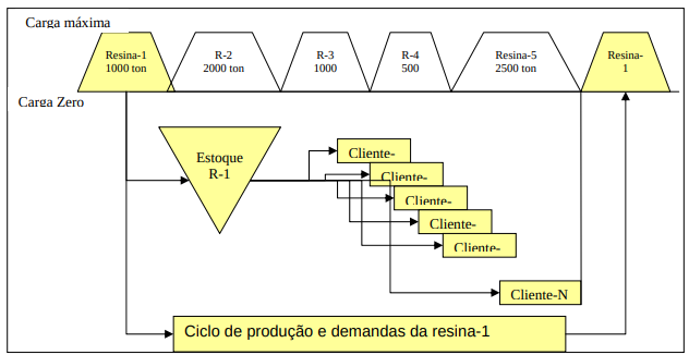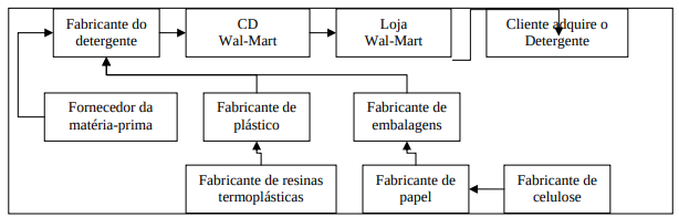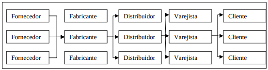 A fonte de matéria-prima, a fábrica e os clientes no geral estão localizados em lugares distintos. A cadeia representa a seqüência de fases da manufatura até que o produto chegue no mercado.