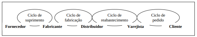 Assim, “[...] o termo cadeia de suprimento representa produtos [...] que se deslocam ao longo da cadeia, formada pelos seguintes estágios: fornecedores, fabricantes, distribuidores, varejistas e clientes” (CHOPRA; MEINDL, 2003).