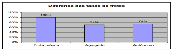 Existem três taxas de fretes praticadas no pólo. O frete contratual entre os embarcadores e as transportadoras contratadas, estabelecido nas concorrências periódicas realizadas pelas empresas do Pólo. E há os fretes pagos aos terceiros, agregados ou carreteiros, pelas transportadoras contratadas. A Figura 42 mostra as relações percentuais entre as três taxas de fretes: