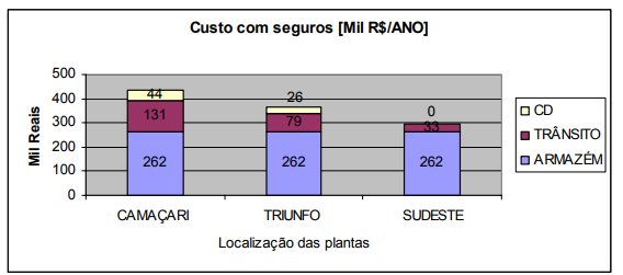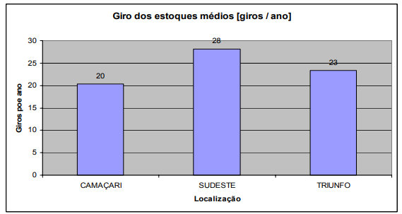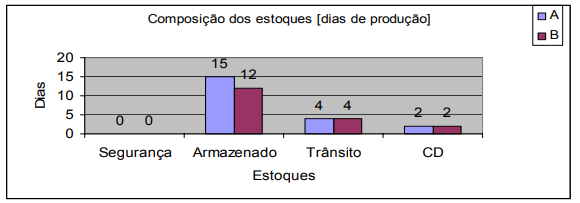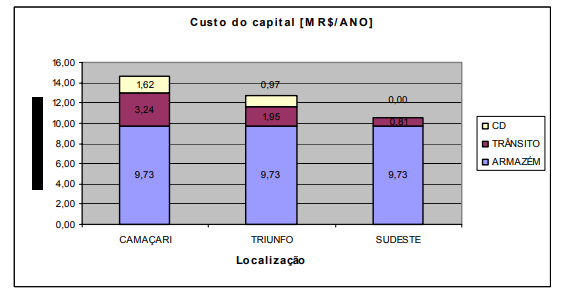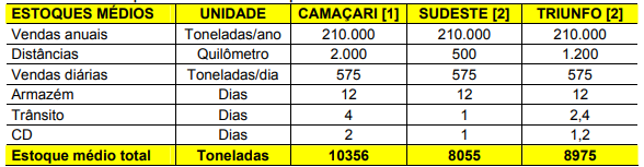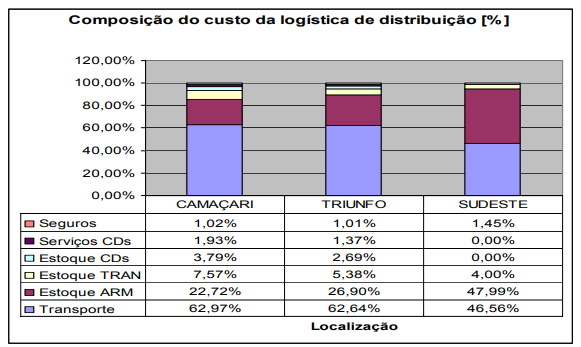 Nas empresas de Camaçari, além dos estoques nos armazéns, temos o acréscimo dos estoques em trânsito e nos CD, aumentando ainda mais o custo para manter estes ativos. Portanto, nas empresas do cluster, tanto o transporte como os estoques são críticos para o desempenho da logística de distribuição.