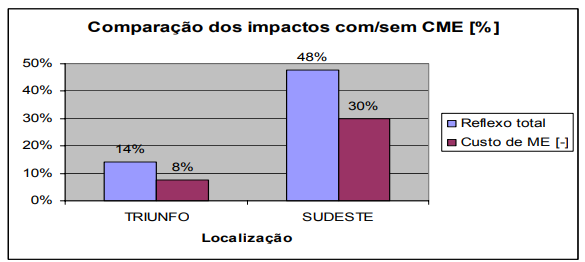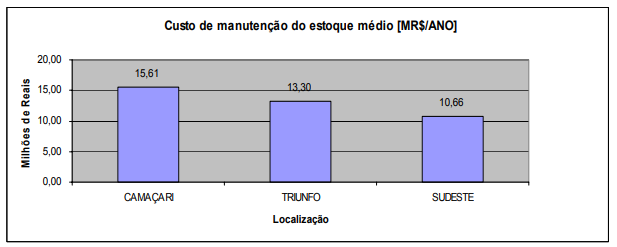 Em relação à Triunfo o impacto nas margens varia de 8 a 14%, e ao Sudeste de 30 a 50%, a depender da política das empresas de contabilizar ou não o custo do capital investido em estoque. Inserido o custo de manutenção do estoque, este participa com 22% e o transporte com 78% no reflexo relativo ao Sudeste. Em relação à Triunfo, o estoque contribui com 35% e o transporte com 65%.