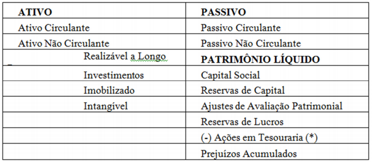 Tradicionalmente o balanço patrimonial é apresentado em uma forma gráfica “T” (forma horizontal), onde do lado esquerdo encontram-se os elementos do ativo e do lado direito o passivo: