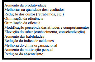 Ao se investir em treinamento espera-se que haja aumento de produtividade, mudanças de comportamento, melhoria do clima humano na organização, redução de custos e de acidentes, rotação de pessoal, além de outros resultados.