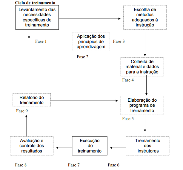 O treinamento é orientado para o presente [...] e o desenvolvimento de pessoas para cargos a serem ocupados futuramente [...]. Sabe-se que a principal estratégia para a realização do treinamento é a estrutura preparada e desenvolvida pela organização. Pois este processo deve estar equilibrado em uma linha de realizações. O treinamento é um processo cíclico e contínuo composto de quatro etapas: diagnóstico, desenho, implementação e avaliação. O importante é lembrar que o treinamento tem a responsabilidade de atingir níveis de desempenho estabelecidos pelas organizações, através da continuidade do seu desenvolvimento.