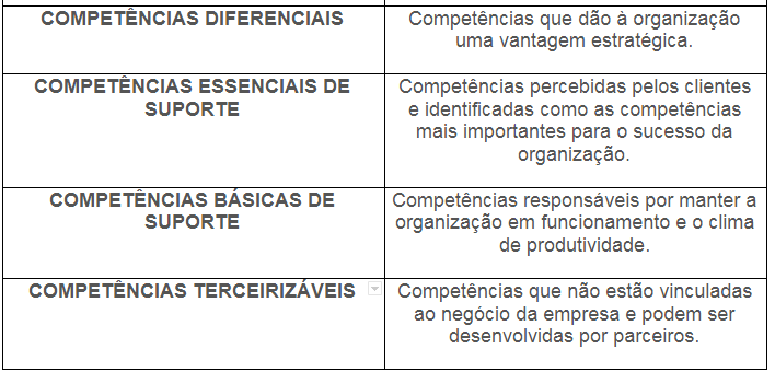 As competências organizacionais podem ser classificadas da seguinte forma: