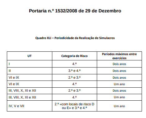 Periodicidade da realização de simulacros – Portaria n.º 1532/2008 de 29 de Dezembro