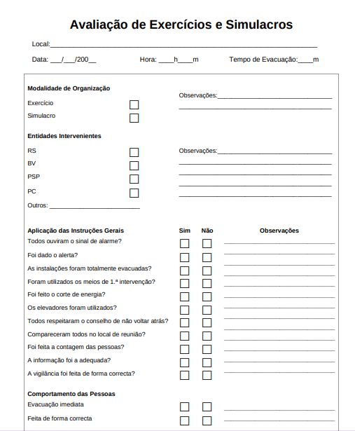 Estes simulacros devem ser devidamente planeados, executados e avaliados com a eventual colaboração do corpo de bombeiros e da Proteção Civil.