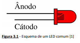 Tal como qualquer díodo, o LED possui dois semicondutores, um ânodo e um cátodo (como mostra a Figura 3.1). Para que seja emitida luz, o potencial do ânodo tem que ser maior que o potencial do cátodo, é a energia perdida entre a passagem de electrões destes dois semicondutores que é transformada em luz [1].